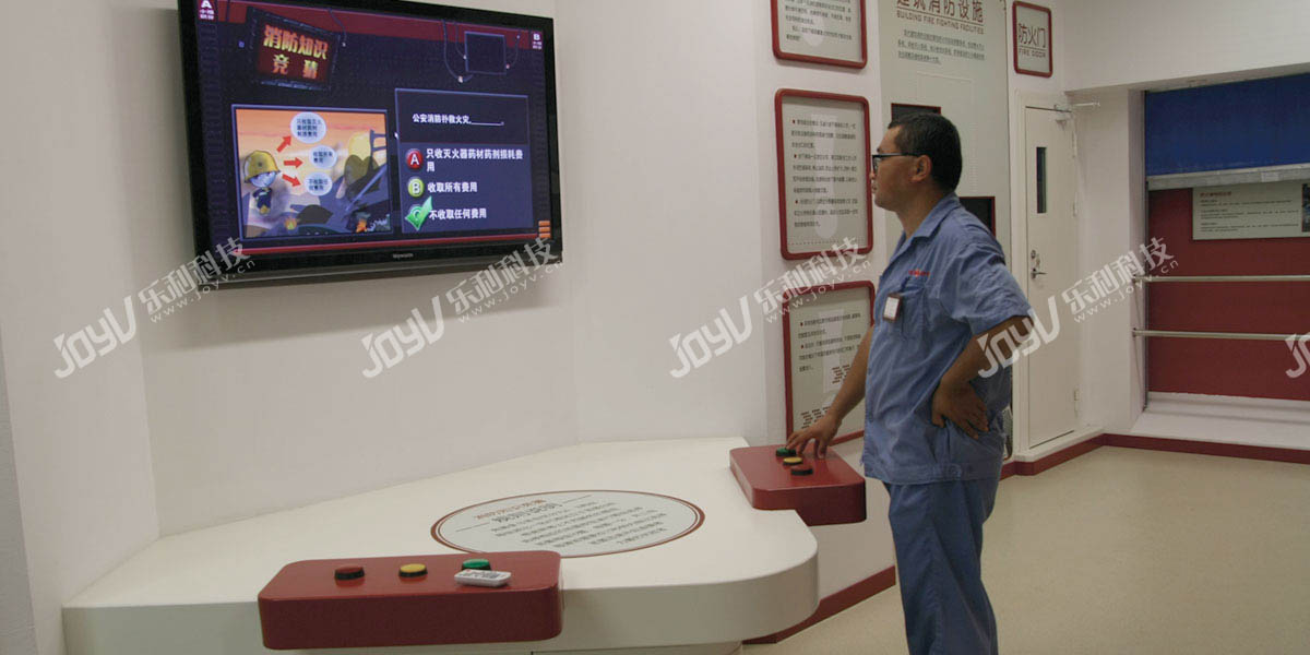 在一面展墙上悬挂一个液晶电视,在每台电视对应的地面上安装一块可以踩踏的感应玻璃,当人踩到玻璃时候,玻璃上内置的灯光开始发亮,这台电视即开始播放对应的知识视频资料。当人脚离开玻璃的时候,玻璃的内置灯光熄灭,视频即刻停止播放,电视又处于待机状态。多个电视都可按以上方式播放不同的视频内容,在给人以神奇感的同时,又达到了向参观者展示相关内容的目的。